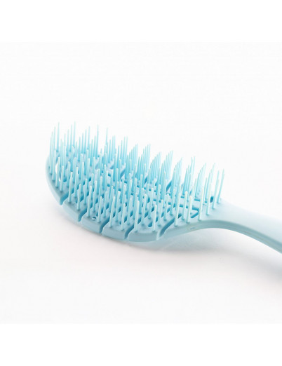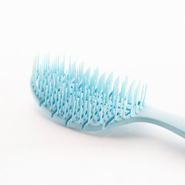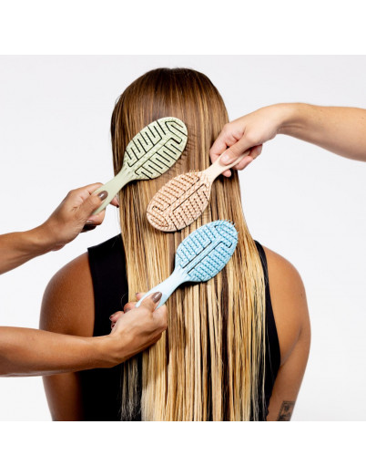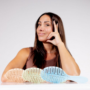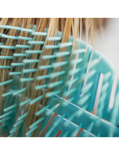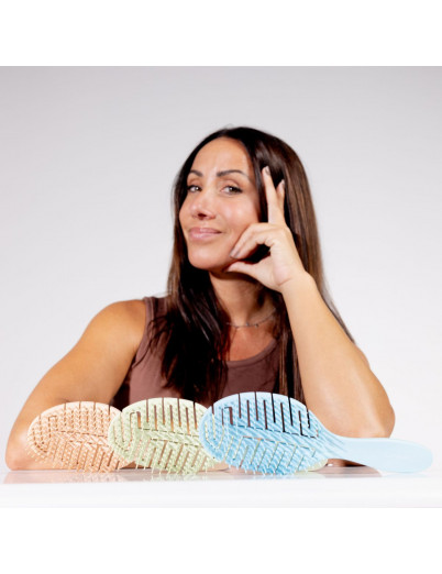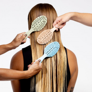 Empieza cepillando siempre desde las puntas y ve subiendo hacia la raíz, permitiendo que las púas flexibles se adapten al contorno de la cabeza. Ideal para cabello seco o mojado y perfecto para usar durante el secado gracias a su base perforada.