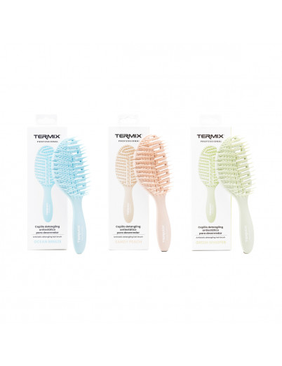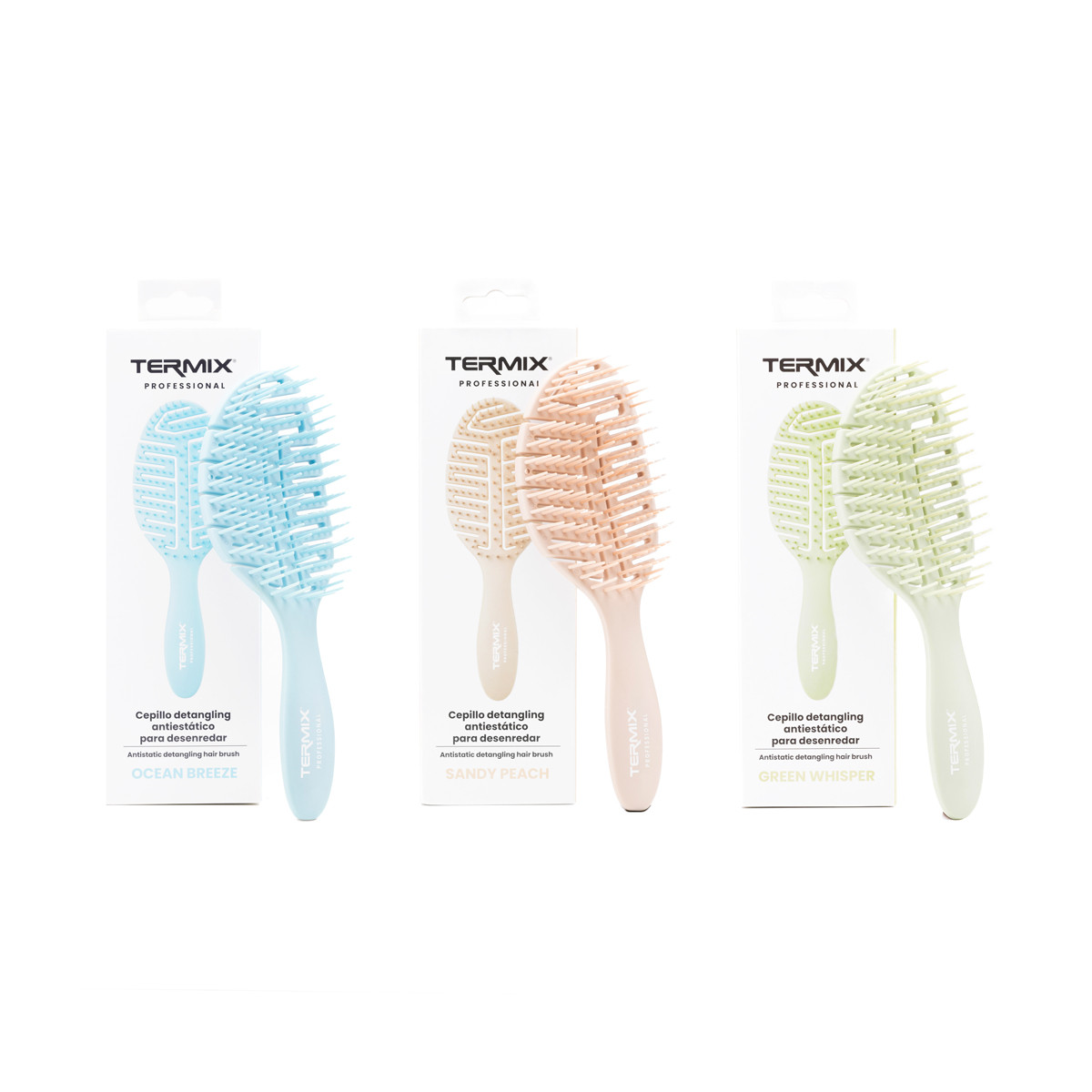 El Cepillo Detangling Antiestático de Termix Professional es la herramienta imprescindible para profesionales que buscan un desenredado eficaz, rápido y sin frizz. Gracias a su tecnología antiestática, elimina la electricidad estática desde la primera pasada, dejando el cabello más pulido, brillante y controlado. Sus fibras flexibles antitirones en dos alturas se adaptan perfectamente al cuero cabelludo, desenredando sin esfuerzo y sin causar roturas. Además, su estructura perforada facilita un secado más rápido al permitir el paso del aire durante el brushing. Compacto, ligero y disponible en tres colores sensoriales-Ocean Breeze, Green Whisper y Sandy Peach-, es el cepillo perfecto para el día a día de los estilista