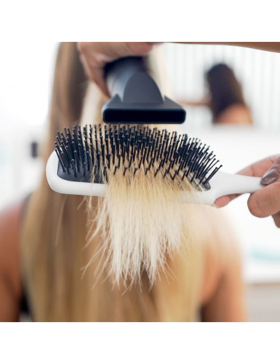 El Cepillo Paddle White de Termix Professional es la herramienta ideal para profesionales que buscan un desenredado eficaz y respetuoso con el cabello. Gracias a su almohadilla neumática flexible y a sus fibras con puntas redondeadas, desenreda sin tirones al mismo tiempo que masajea el cuero cabelludo, favoreciendo un cabello más sano y fuerte. Su base extra ancha permite trabajar secciones grandes de cabello, optimizando tiempos en el salón sin renunciar a un acabado pulido y brillante. Además, es resistente al calor del secador, lo que lo convierte en un aliado perfecto tanto para desenredar como para preparar el cabello antes de cualquier peinado. Con un diseño blanco minimalista y elegante, el Paddle White combina estética y funcionalidad.